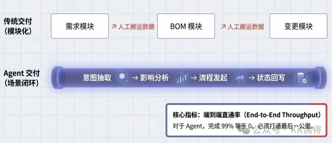 以前我们习惯按模块交付:需求管理上线了、BOM 管理上线了,项目就算里程碑完成。 但对 Agent 来说,如果不能把事办完,价值就是 0。跨模块的断点,是 Agent 的死穴。