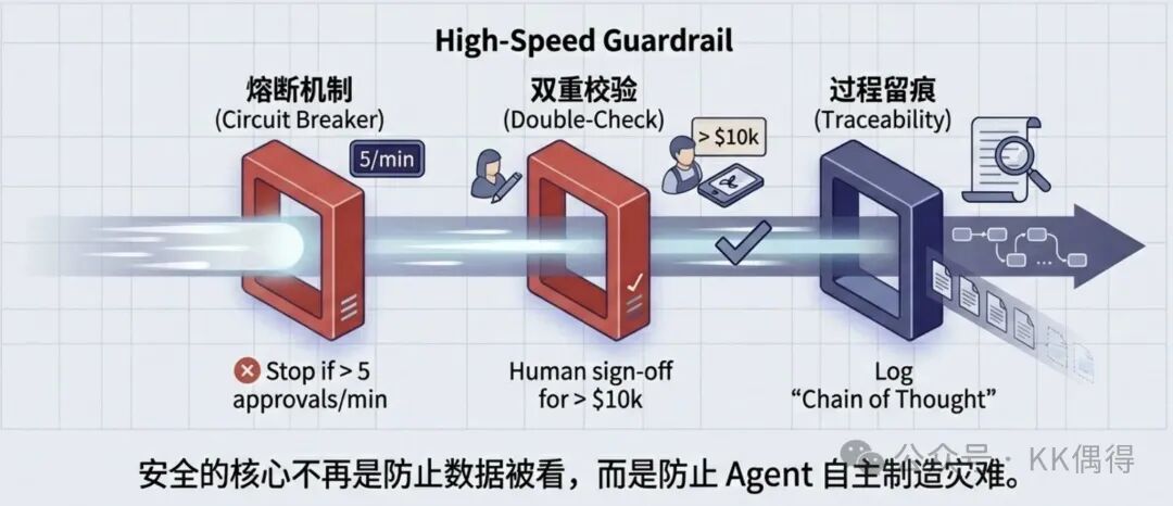 - 现在:监控 Agent 的行为——“当连续触发大额审批时,自动熔断并降级为人工确认”;“所有高风险动作必须双重校验并留痕”。