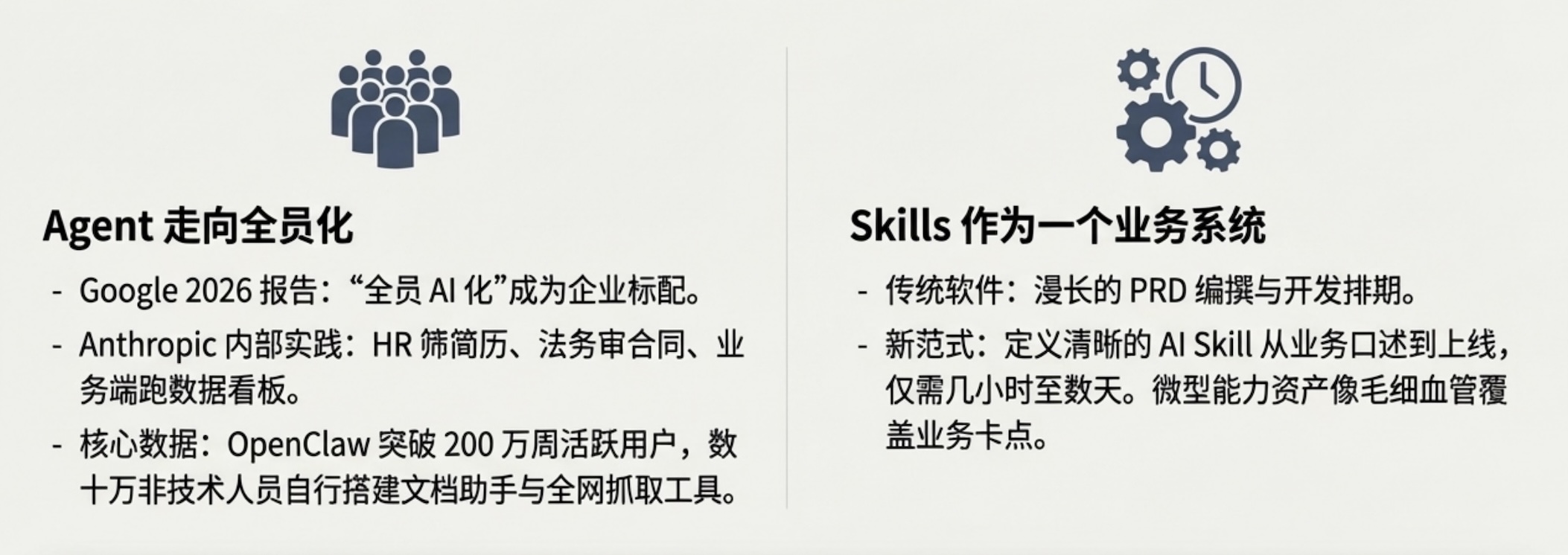 - 许多企业在跑通此敏捷模式后,内部的 Skill 市场会迅速沉淀出成百上千个微型能力资产,像毛细血管一样覆盖销售、法务、人事的各个具体卡点。