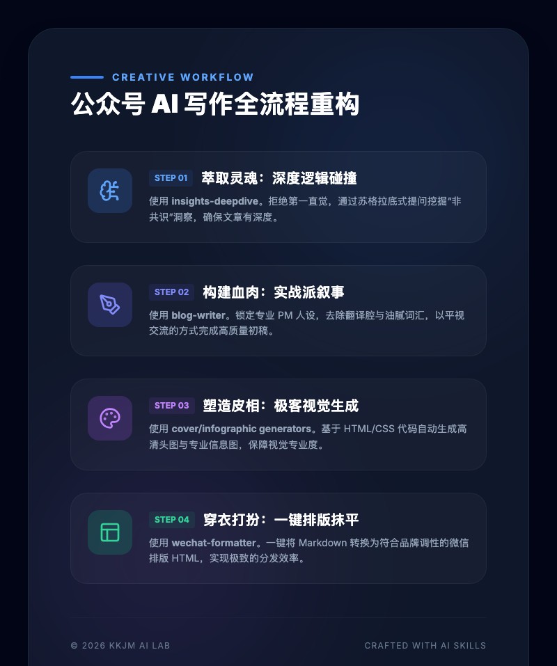 最近我把微信公众号的写作流程做了一次标准化,整理出了 5 个专门的 AI Skills。这套方案的设计初衷很简单:一是想把繁琐的排版校对彻底交出去,把手感留给思考;二是想在深度创作时,找个能随时“接住”逻辑的陪练。
