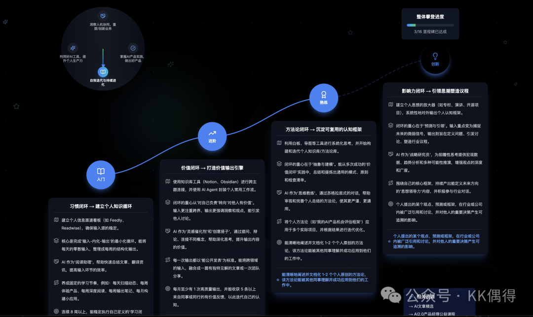 AI 带来的最大挑战,不是工具的变化,而是对我们认知框架的冲击。过去十年积累的很多产品经验,可能需要我们鼓起勇气,亲手打破它。这个方向的进阶路径强调建立持续的"输入-内化-输出"认知闭环: