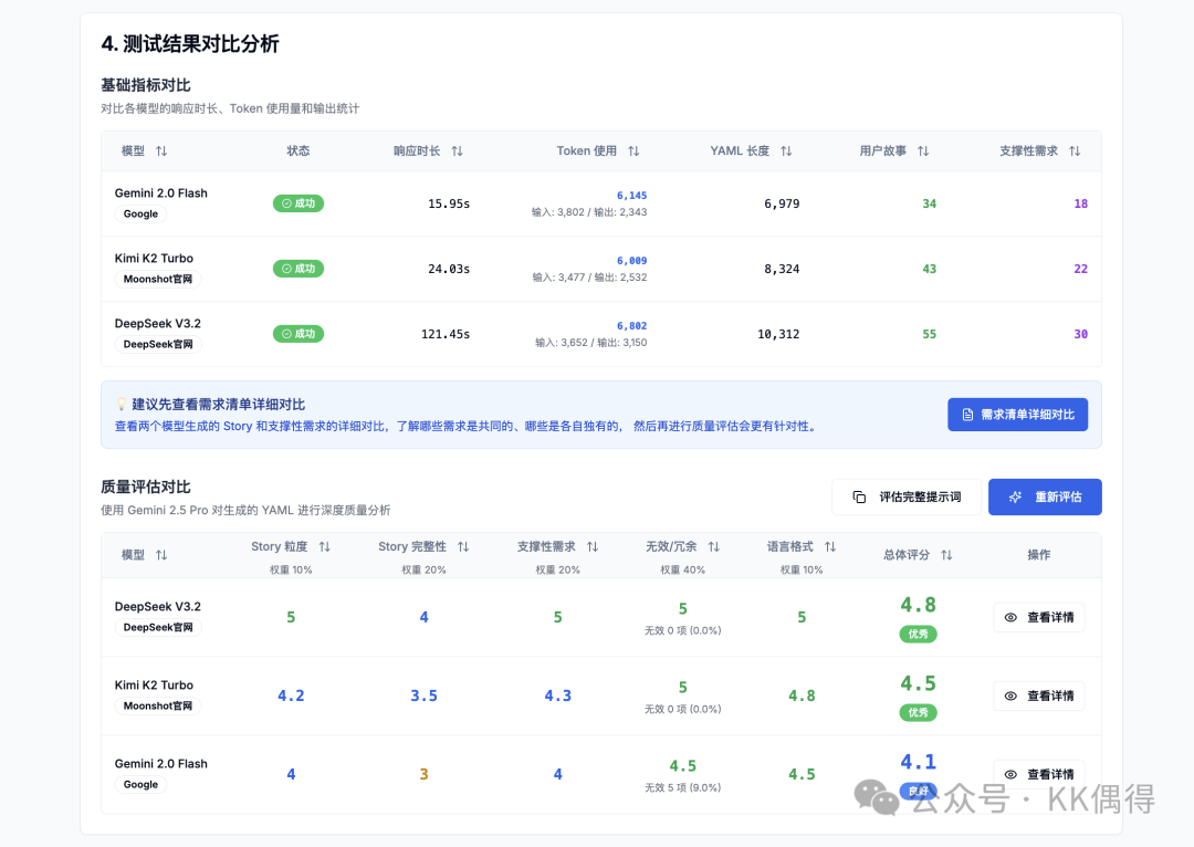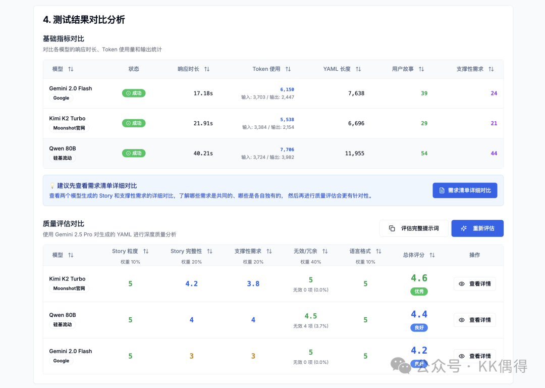 质量评估:使用 Gemini 2.5 Pro 作为评估模型,从需求覆盖度(30%)、结构完整性(20%)、描述质量(10%)、无效内容比例(40%)等维度进行智能评分。
