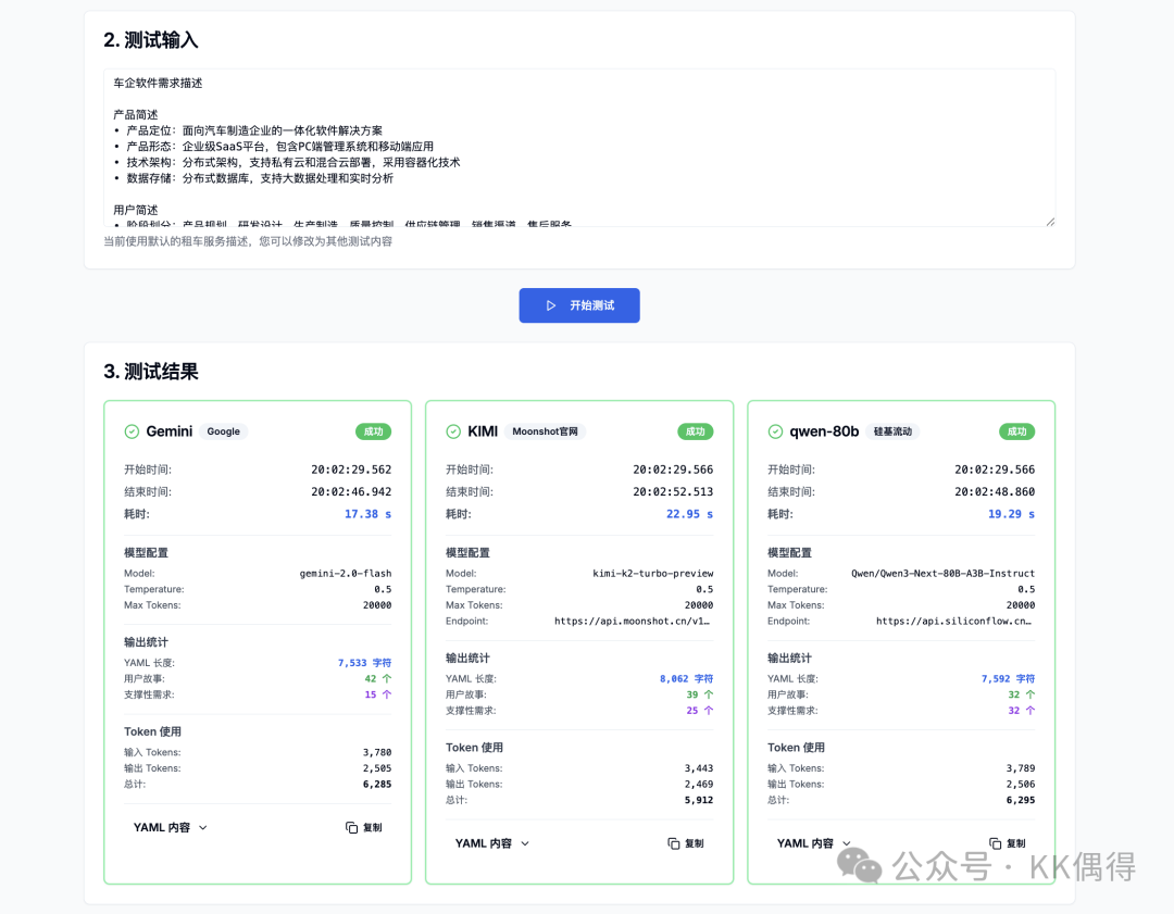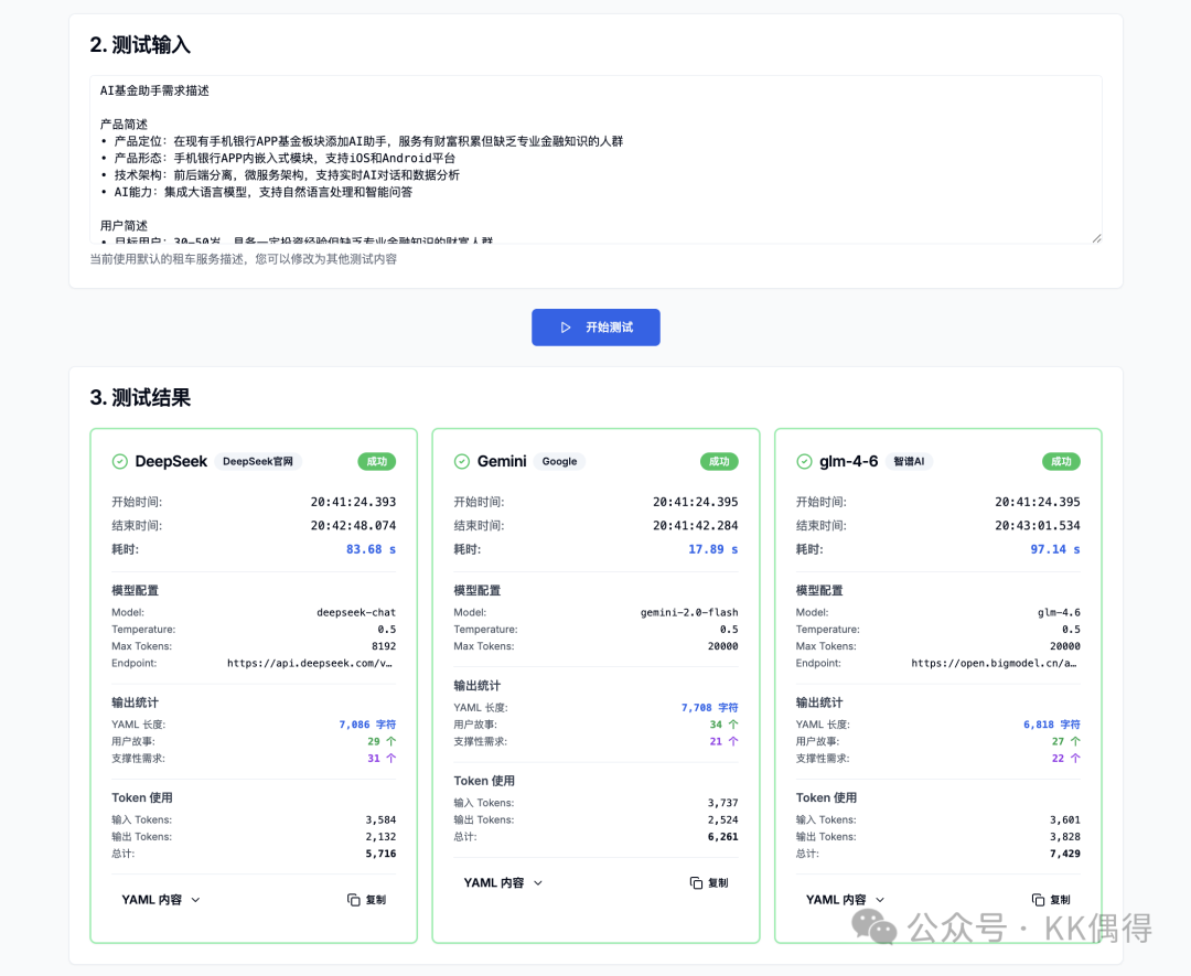基础指标:响应时长、Token 使用量、输出统计(YAML 长度、用户故事数、支撑性需求数)